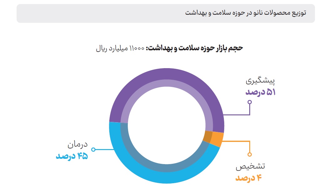 استفاده از نانوذرات و فناوریهای نوین در حوزه سلامت، نه تنها باعث بهبود کیفیت محصولات شده، بلکه بازار قابلتوجهی را نیز به خود اختصاص داده است. بر اساس دادههای موجود، حجم بازار نانو در بخش سلامت و بهداشت ایران در ابتدای سال ۱۴۰۳ به رقم ۱۱۰۰۰ میلیارد ریال رسیده است که شامل بخشهای پیشگیری، تشخیص و درمان میشود. دارورسانی با سهم ۴۰ درصدی، در این بازار پیشتاز است.