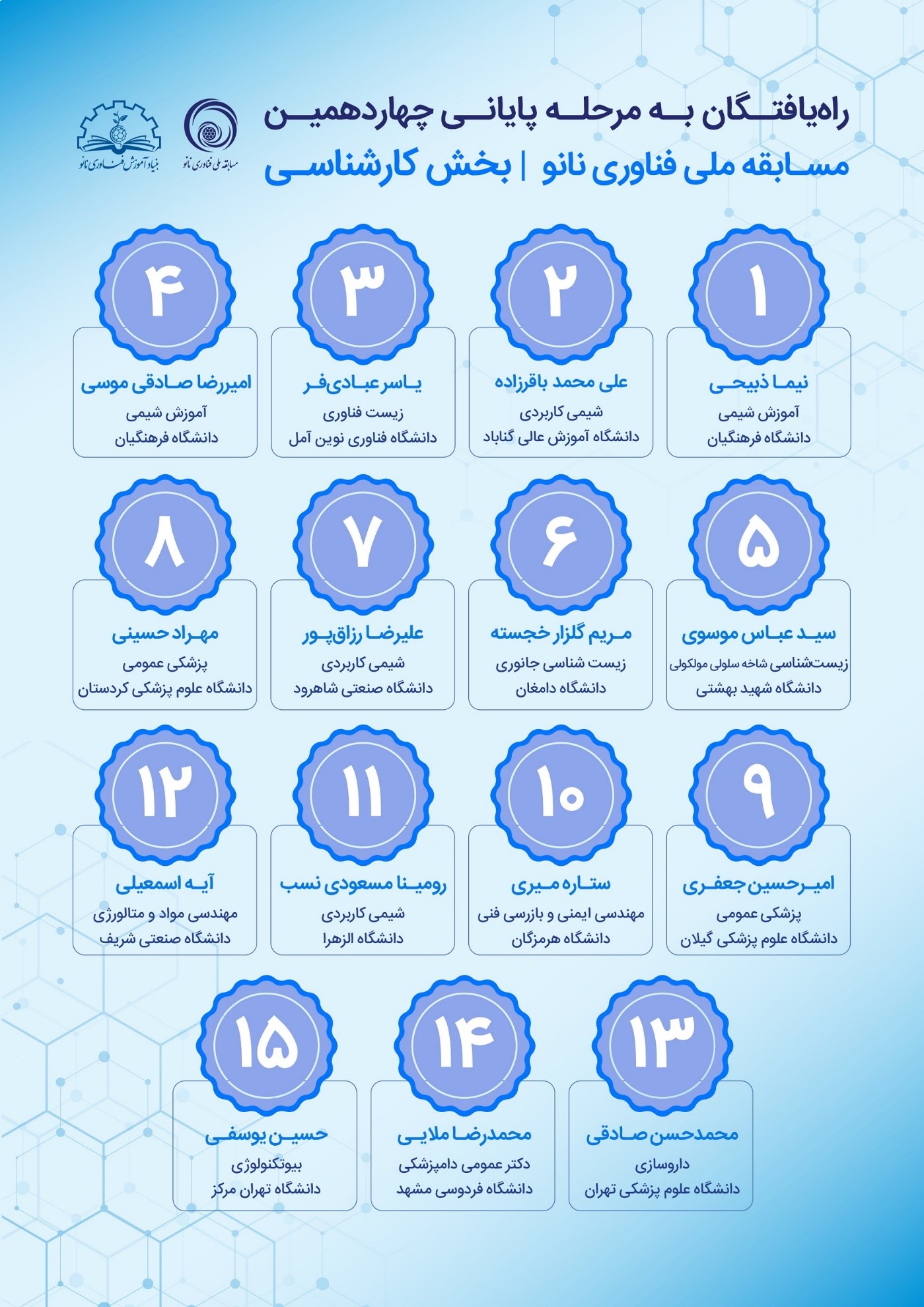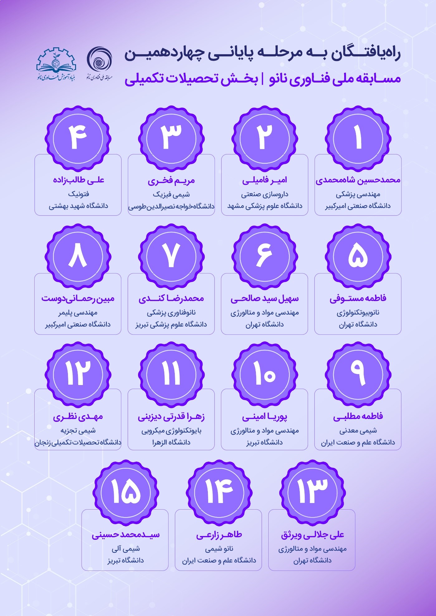 اسامی راهیافتگان به مرحله سوم چهاردهمین مسابقه ملی فناوری نانو به تفکیک مقطع در ادامه آورده شده است: