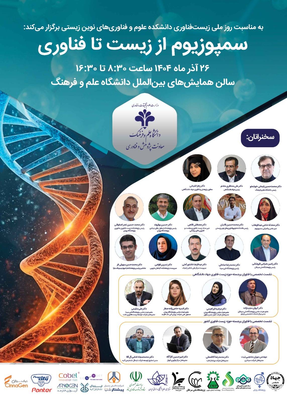 سمپوزیوم ملی «از زیست تا فناوری: رویای ممکن» روز دوشنبه ۲۶ آذرماه ۱۴۰۴ به همت دانشگاه علم و فرهنگ و با دبیری دکتر محدثه حاجی عبدالوهاب برگزار می‌شود. این رویداد علمی با محوریت بررسی تازه‌ترین دستاوردها و فرصت‌های حوزه زیست‌فناوری و با هدف تقویت تعامل میان دانشگاه، پژوهش و صنعت برنامه‌ریزی شده است.