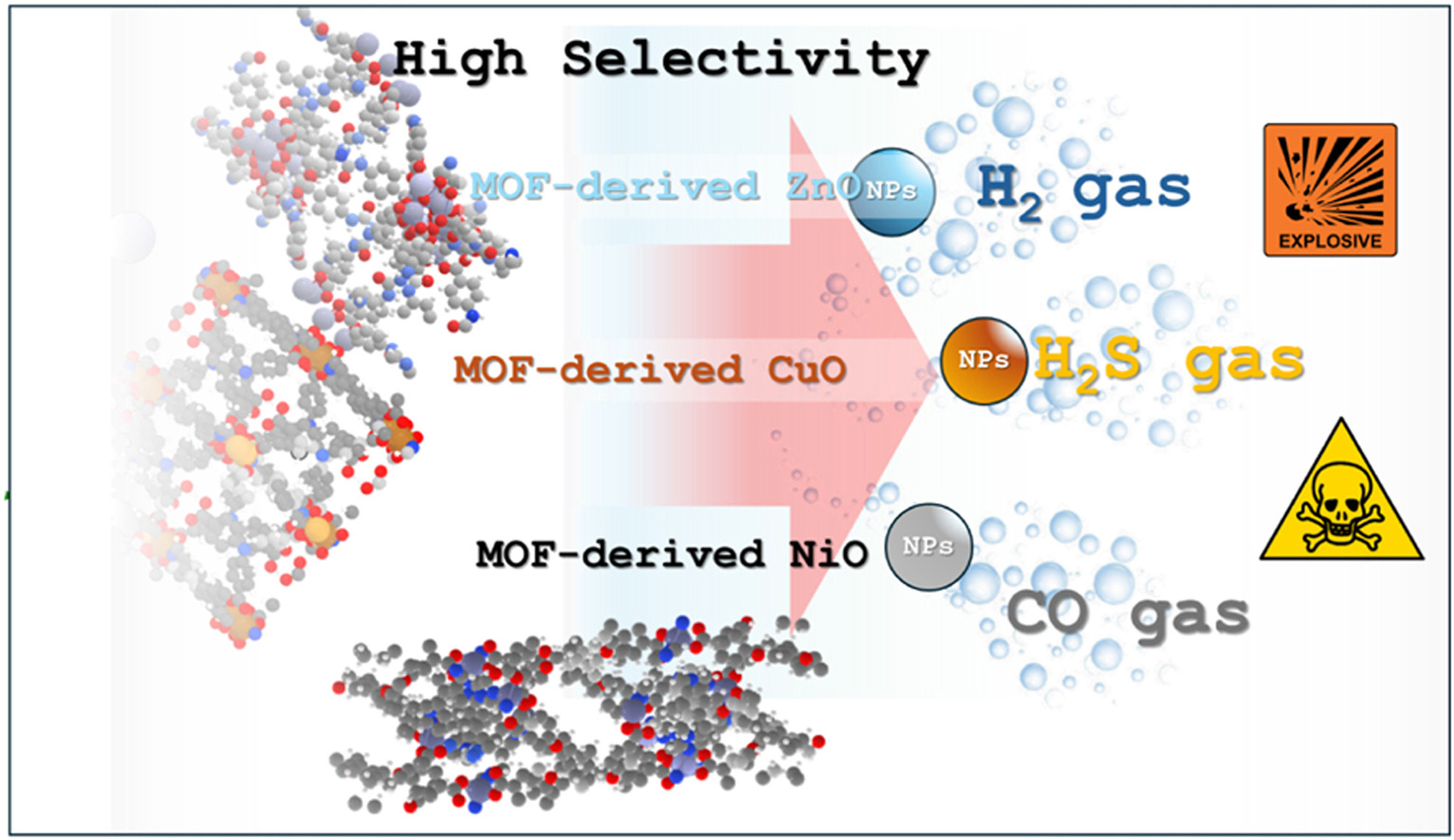 پژوهشهای انجامشده نشان میدهند که تبدیل MOFها به اکسیدهای فلزی با تنظیم دما و شرایط سنتز میتواند به بهبود ویژگیهای حسگری و انتخابپذیری آنها منجر شود. این حسگرهای گازی مبتنی بر اکسیدهای فلزی CuO، NiO و ZnO میتوانند در شناسایی گازهای خطرناک مانند H2S، CO و H2 با دقت و انتخابپذیری بالا به کار روند و گامی مهم در جهت توسعه فناوریهای پایش آلایندهها و گازهای سمی باشند.
